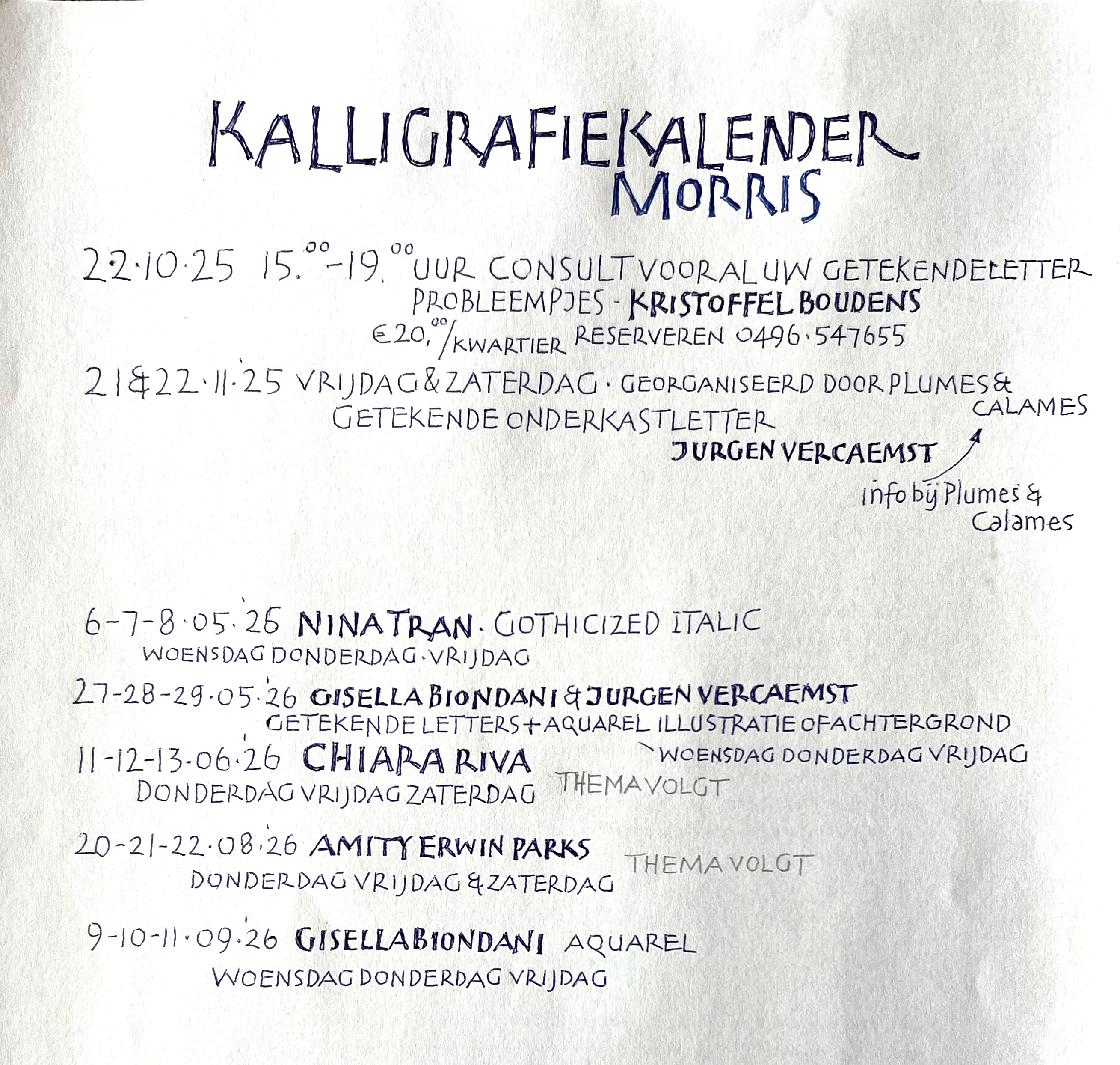 Naast externe initiatieven organiseren wij zelf ook regelmatige verschillende workshops. Kalligrafie voor beginners en gevorderden, koffie & thee, etc. Er is voorlopig nog geen nieuwe kalligrafiekalender opgesteld, onderstaande kalender is gedateerd, onze excuses. Van zodra mogelijk, maken we een nieuwe kalender op.